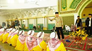 BAGANSIAPIAPI– Bupati Rokan Hilir (Rohil) Afrizal melepas 282 Calon Jemaah Haji (CJH) Kloter 14 asal Kabupaten Rohil Provinsi Riau menuju Embarkasi Batam dari Masjid Al Ikhlas, Bagansiapiapi,Senin (24/5/2024) pagi. diwarnai isak tangis sanak keluarga CJH.