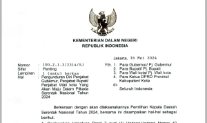 Surat Mendagri itu ber-Nomor 100.2.1.3/2314/SJ Perihal Pengunduran Diri Pj Gubernur, Bupati/Wali Kota yang akan Maju dalam Pilkada Serentak Nasional 2024 tertanggal 16 Mei 2024.