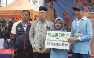 Hadiah umroh dari Bupati Kuansing Dr H Suhardiman Amby (kiri), diterima Attira Dennova. Hadiah dicabut Prof HT Dahril dan dikerjakan oleh Suhu Wan (kanan).